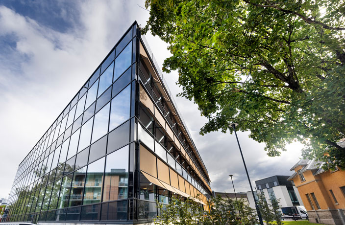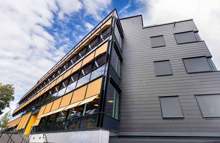 På Neosol är vi glada över att vi fick förtroendet att optimera solskyddet till detta hållbara hus. Totalt levererade vi 130 utvändigt monterade markiser med värmereflekterandeväv och automatisk styrning fördelat på tre zoner. Mer specifikt bestod den av 60 markisoletter med mangofärgad väv och 70 vertikala markiser med grå väv, där samtliga profiler lackerades i egen vald kulör.