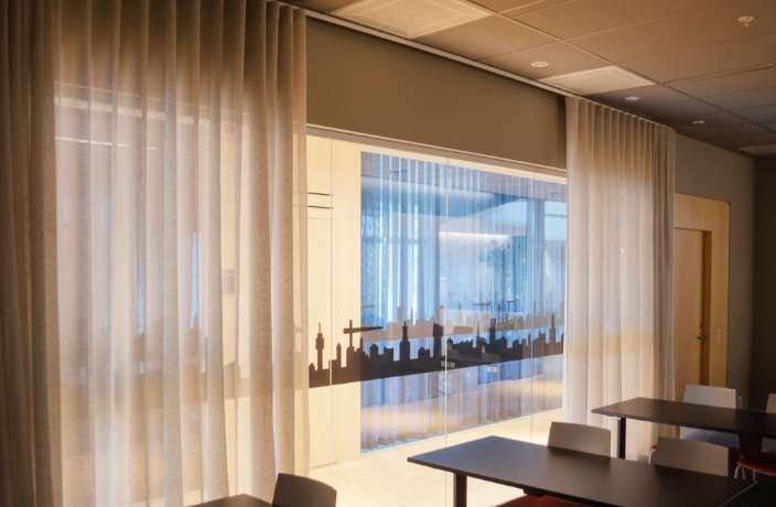 Tack vare vårt heltäckande produktutbud i kombination med egna kunniga montör fick vi uppdraget att leverera den invändiga solavskärmningen samt textilgardiner. Totalt levererade vi drygt 370 rullgardiner för solskydd, 80 textila gardiner samt rullgardiner för mörkläggning och löste på så sätt projektets alla behov kring solskydd, mörkläggning och avskärmning.